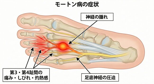モートン病は、足の指の間を通る神経が圧迫されて炎症を起こす疾患です。特に第3趾と第4趾の間(中指と薬指の間)に多く発症しますが、第2趾と第3趾の間にも起こることがあります。