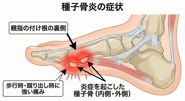 種子骨は親指の付け根の裏側にある2つの小さな骨で、歩行時に体重を支えるクッションの役割をしています。ランニングやジャンプなどの繰り返しの衝撃、硬い地面での運動、足の裏に負担のかかる靴の使用などが原因で炎症を起こします。