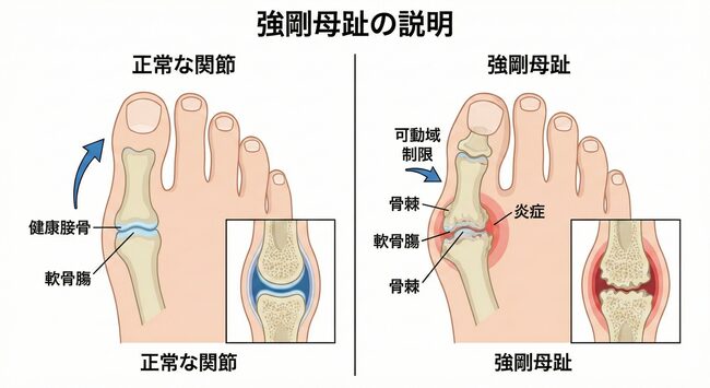 強剛母趾は、親指の付け根の関節(第一中足趾節関節)の軟骨がすり減り、骨棘ができて関節の動きが制限される疾患です。歩くときに親指を反らす動作で痛みが出るため、歩行に支障をきたします。