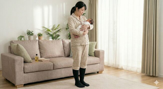 授乳姿勢も重要な要因です。長時間同じ姿勢で座ったり、赤ちゃんを抱いて立ち続けたりすることで、下半身の血流が滞りやすくなります。特に足首の動きが制限されると、筋ポンプ作用がさらに低下してしまいます。