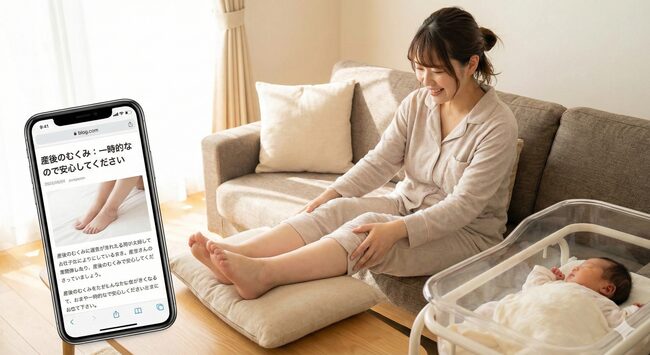 このむくみは、妊娠・分娩によって増えた体液やホルモンバランスの急変、授乳による睡眠不足や運動不足などが重なって起こる症状です。ほとんどの場合は一時的なもので、適切なケアによって改善できます。