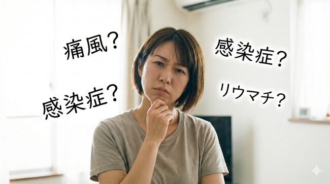 | 関節リウマチ | 朝のこわばり、対称性 | 自己免疫疾患 | 血液検査、複数関節の症状 |