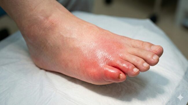 - 痛風発作:夜間突然発症、激痛、関節の発赤腫脹