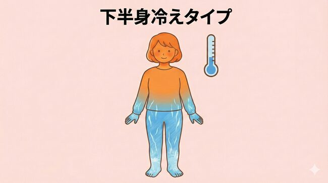 下半身冷えタイプは、上半身は温かいのに腰から下が冷えるのが特徴です。特に足先や足の裏、ふくらはぎなどが冷たく、むくみやすい傾向があります。