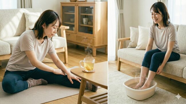 入浴後は体が冷えないよう、すぐに保温し、靴下やレッグウォーマーで足元を温めるとさらに効果的です。