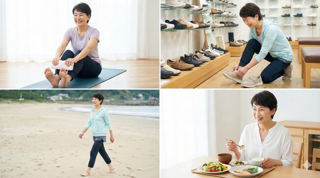 また、小股で歩くことで着地衝撃が抑えられるため、膝や腰への負担が軽減されます。まずは「背筋を伸ばして、小股小股♪」とリズム良く歩くことから始めてみましょう。日々の何気ない歩行が、そのまま足を整えるトレーニングに変わります。