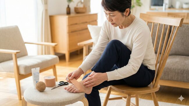外反母趾や横アーチ崩れによる足の痛みには、まずセルフケアで炎症を抑えることが有効です。足裏マッサージは血流を促進し、筋肉や筋膜の緊張をほぐします。