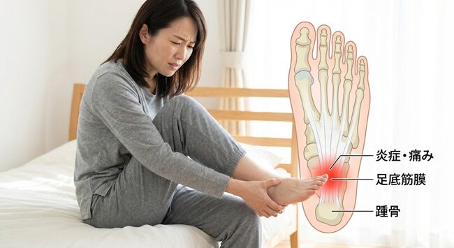 足底筋膜炎は、かかとから足指の付け根にかけて張っている足底筋膜に炎症が起こる疾患です。朝起きて最初の一歩で強い痛みを感じることが特徴的で、歩き続けると痛みが和らぐこともあります。