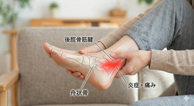 後脛骨筋腱障害は、足の内くるぶし周辺から土踏まずにかけて走行する後脛骨筋腱に炎症や損傷が起こる疾患です。後脛骨筋は足のアーチを支える重要な役割を担っており、この腱に問題が生じると足の内側に痛みや腫れが現れます。