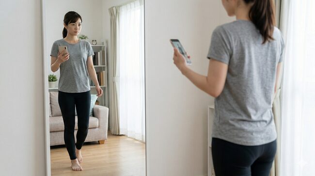 自分の歩き方を客観的に知ることは、改善の第一歩です。全身が映る鏡の前で横を向いて歩き、姿勢や腕の振り、足の動きを確認してみましょう。スマートフォンで歩行を動画撮影し、後から見直すのも効果的です。