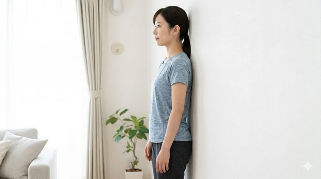 壁に背中をつけて立つチェック方法も有効です。後頭部・肩甲骨・お尻・かかとの4点が自然に壁につくのが理想的な姿勢です。後頭部が壁につきにくい場合は、猫背が進行している可能性があります。