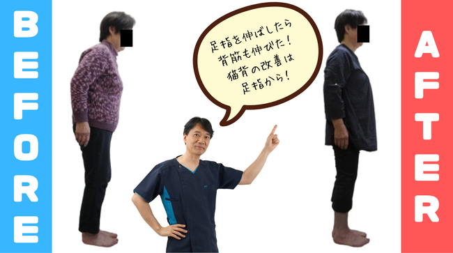 痛みから解放されただけでなく、足指でしっかりと体を支えられるようになった結果、丸まっていた腰がピーンと伸びていたのです。その若々しい姿勢の変化には、一緒に行ったお孫さんが一番驚いていたそうです。