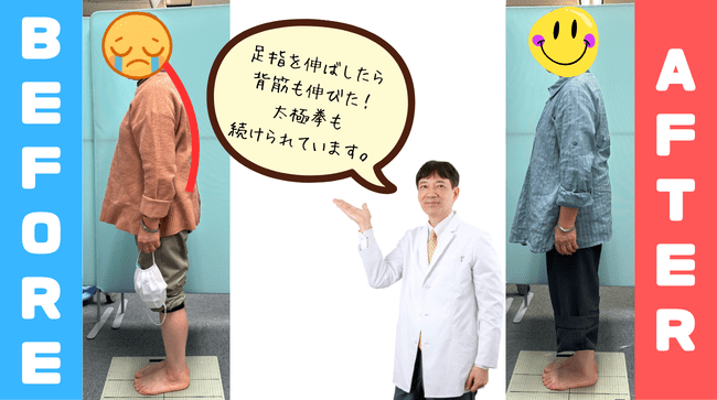 あんなに悩んでいた膝の痛みもいつの間にか気にならなくなり、今では太極拳の仲間からも「立ち姿がシャキッとしたわね」と言われることが増えたそうです。足指が広がり、土台である足元が安定したことで、丸まっていた背筋が自然と伸び、膝への負担も軽減されたのです。