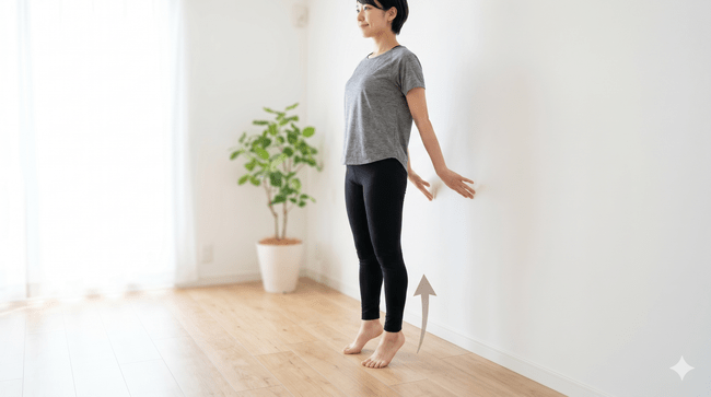 次に、かかと上げ運動を行います。足指で床をしっかり押えた状態でかかとを上げ、つま先立ちになります。バランスを取りながら3秒キープし、ゆっくり戻します。10回を1セットとして、1日2〜3セット行うのが理想です。