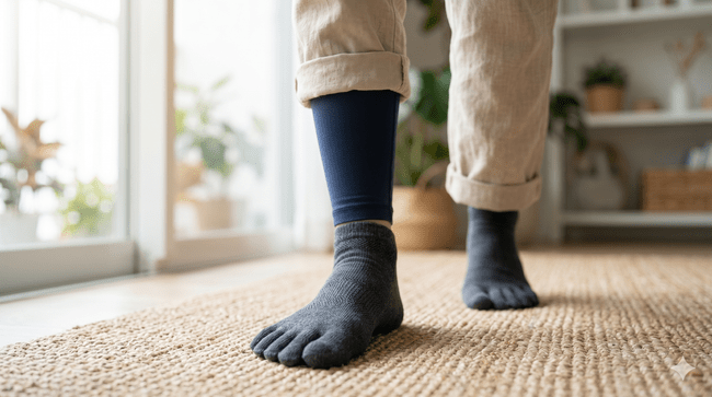 半信半疑ながらも、Aさんは履くだけで足指をやさしく広げる「ゆびのばソックス」を毎日の生活に取り入れてみました。履いた瞬間に感じたのは、指の間にしっかり布が入り込み、足裏全体でピタッと床を掴むような、これまでにない安定感でした。